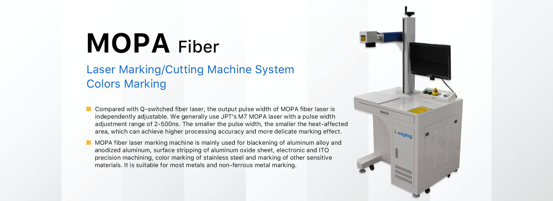 MOPA ファイバー レーザー マーキング マシンは、直接電気変調半導体レーザーをシード ソース (MOPA) ソリューションとして使用するファイバー レーザーです。 完璧なレーザー特性と優れたパルス形状制御機能を備えています。 MOPAはMaster Oscillator Power Mplifierの略です。 Q スイッチ ファイバー レーザーと比較して、MOPA ファイバー レーザーのパルス周波数とパルス幅は独立して制御可能です。 2 つのレーザーパラメータを調整して一致させることにより、一定の高いピークパワー出力を達成でき、より広範囲のマーキング基材に適用できます。 たとえば、プラスチックやその他の敏感な素材へのマーキング、陽極の剥離、コーティングの剥離、半導体や電子機器へのマーキング、ステンレス鋼への色のマーキング、酸化アルミニウムへの黒色のマーキングなどです。